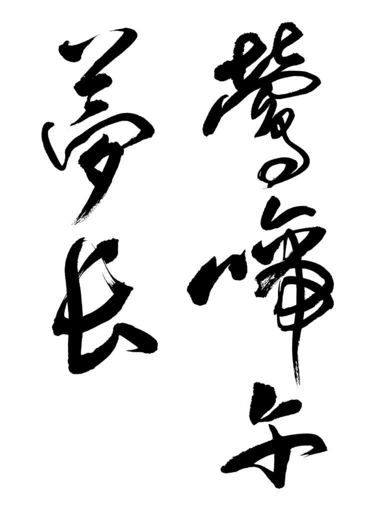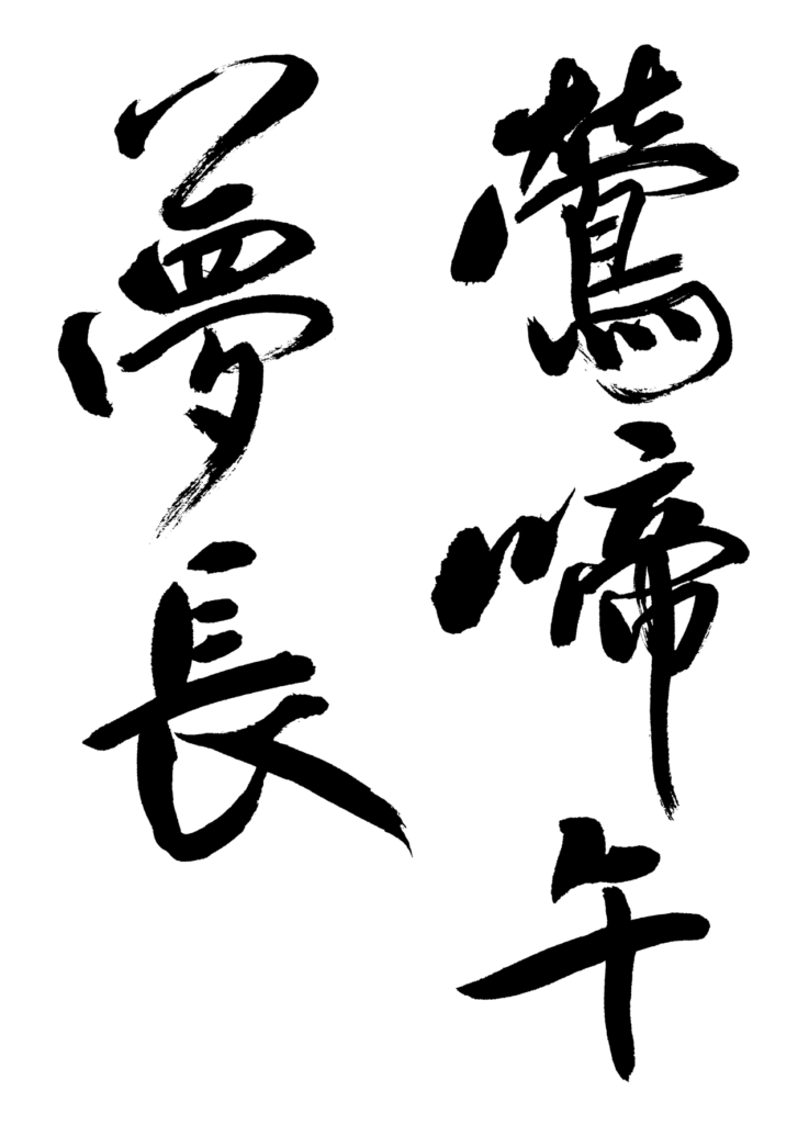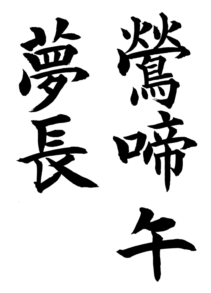 「鶯啼午夢長」左上より解説をしていきます。北魏楷書の書き振りです。どの書体もツではなく火二つの火を書きます。つまり旧字体で書表現をするということです。重厚かつ、方筆の鋭利な線を引きましょう。夢の夕に存在感を発揮してください。