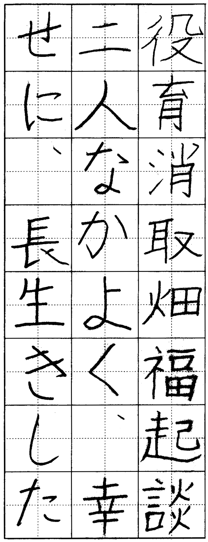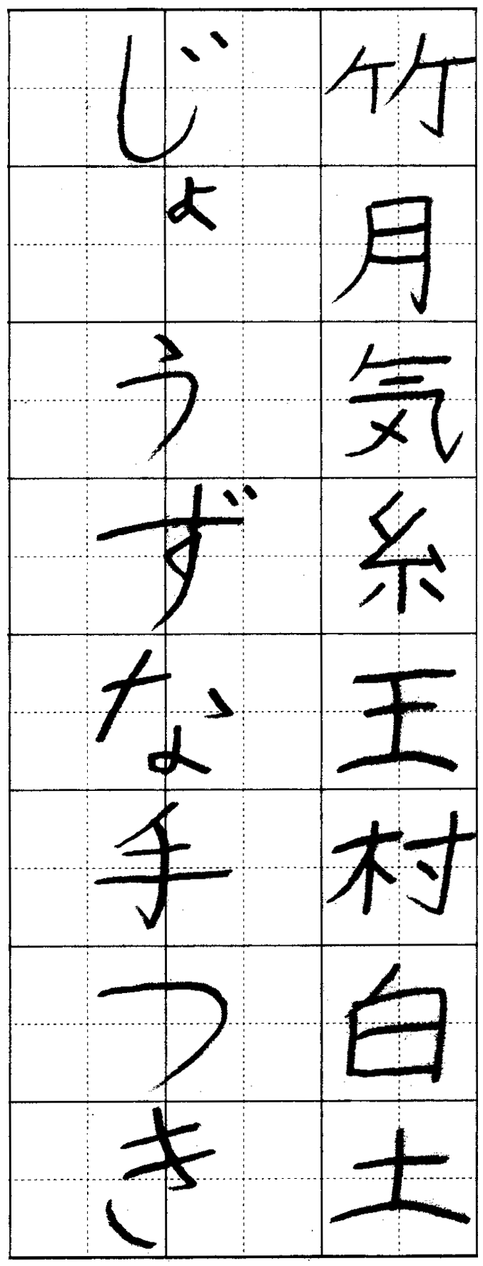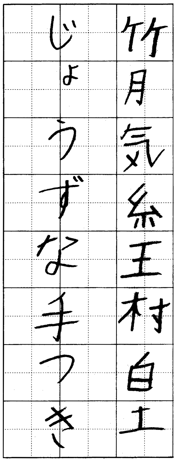 一年生、たてせんが何本もありましたが、まっすぐ下にひけましたか。月・王・村・土、特に王と土はちゅうしんせんの上をまっすぐ下に引きたかったね。ひらがなのじ・う・ず・つ、はとめないようにちゅういしようね。
