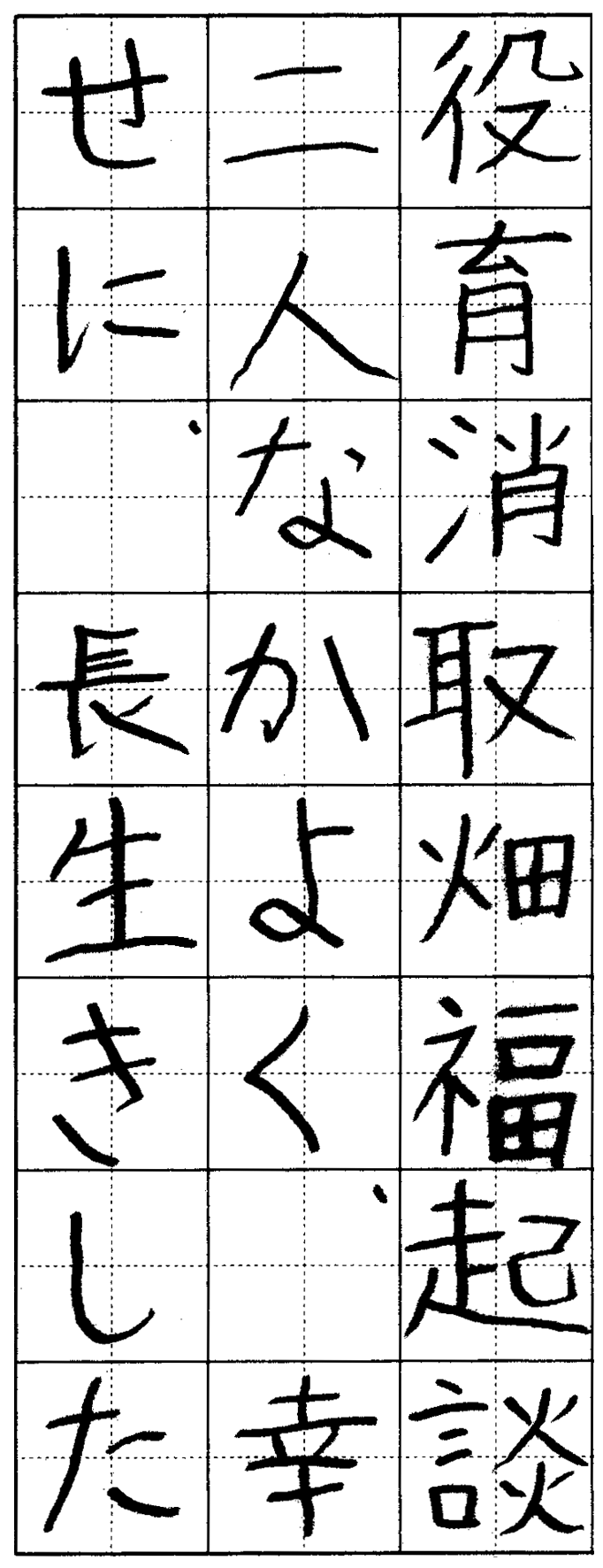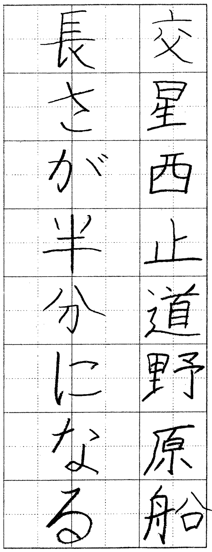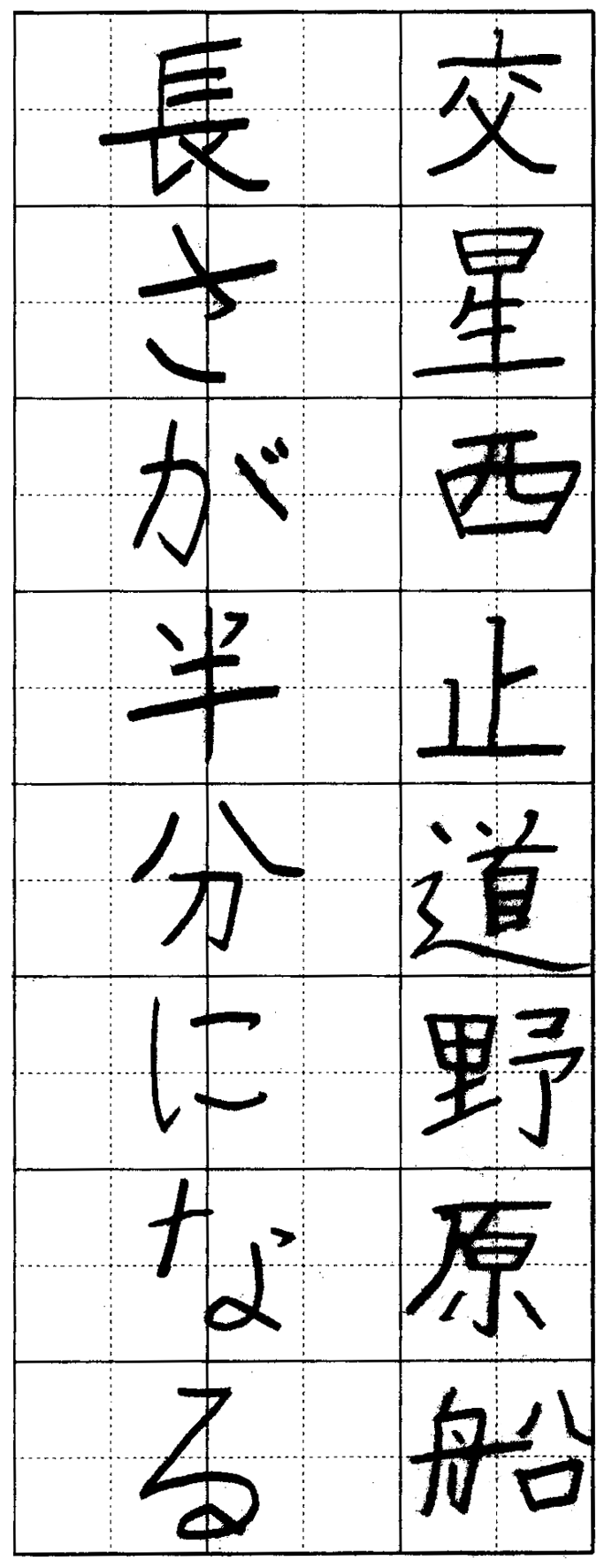 二年生。横せんと横せんの間がとうかんかくになると良い字、星、道、園、原、長、右上りで同じアメちゃんが入るといいよ。口や日の下のところがあいてはいけないよ。お金がおサイフからこぼれちゃうよ。