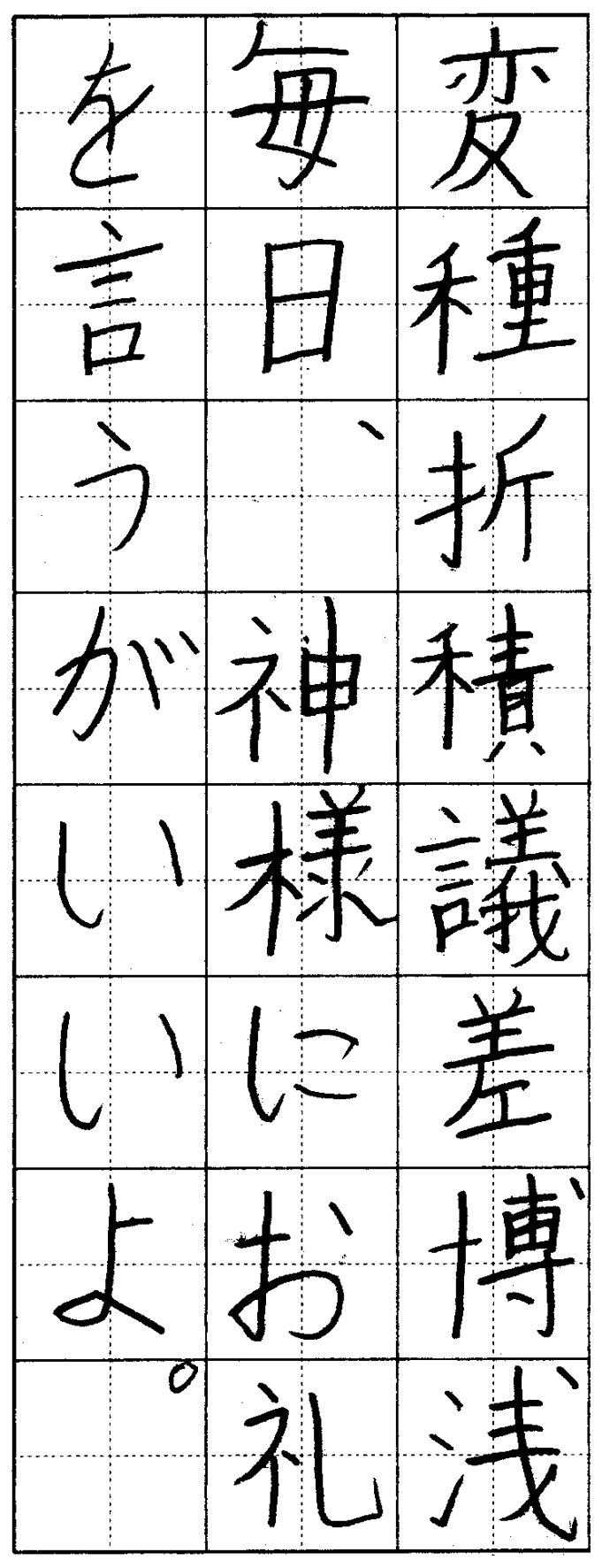 四年生のみなさん、先月の昇段試験の時は、しっかりとした硬筆作品を書いてくれましたが、今月は、どうも手抜きの作品を多く目にしました。転折が折れてなくカーブ。左払いが止まっている。右払いが止まって横に払う、ができていないなど!!口にあなが空いていることはないようにしてください。
