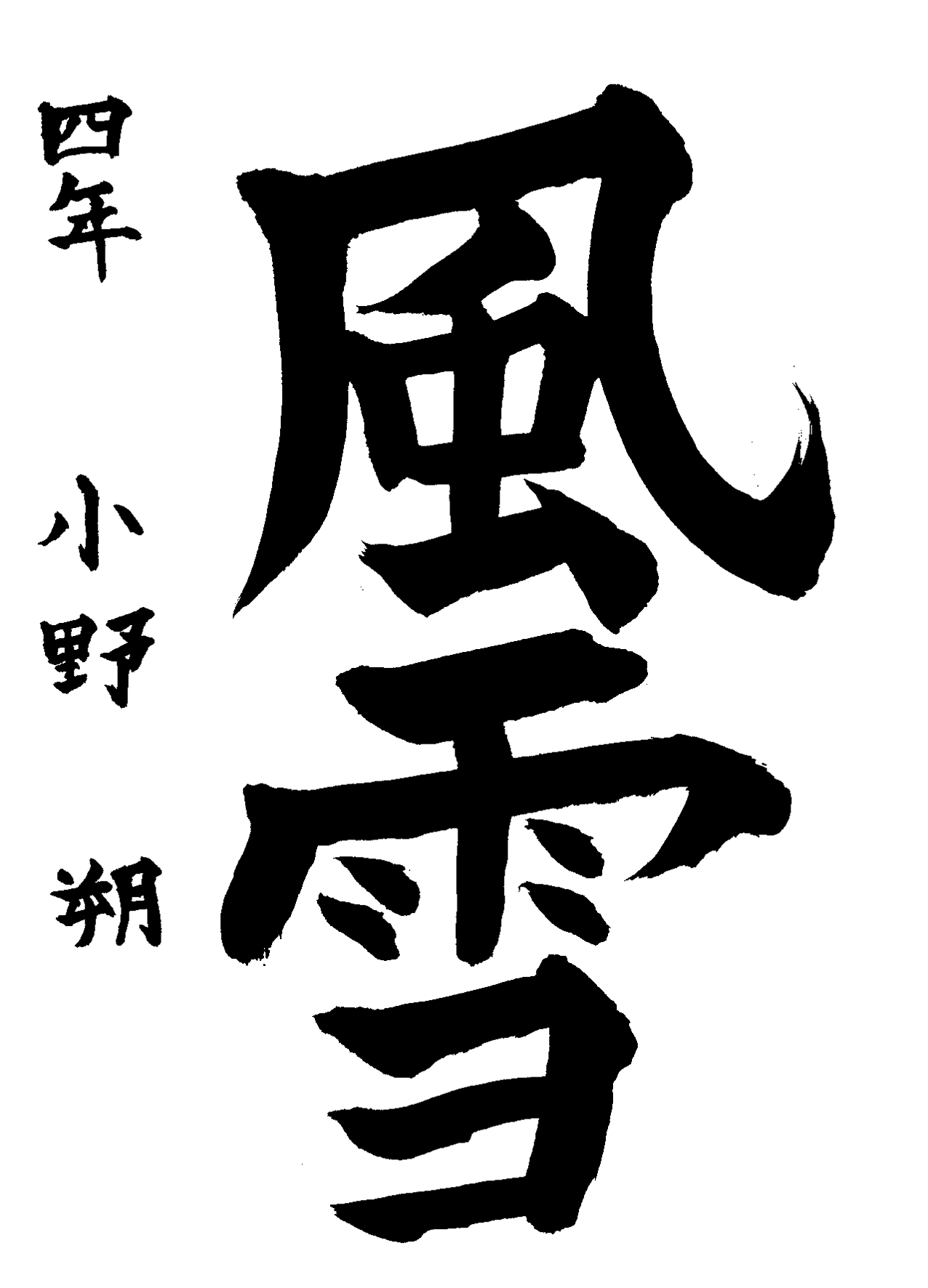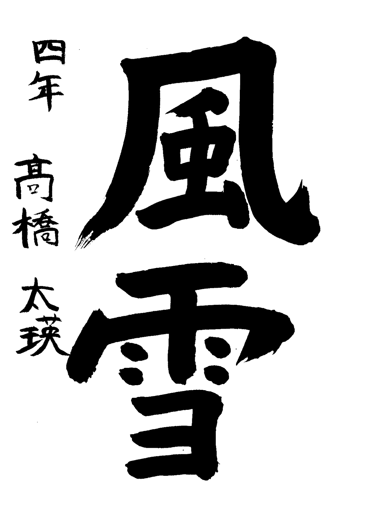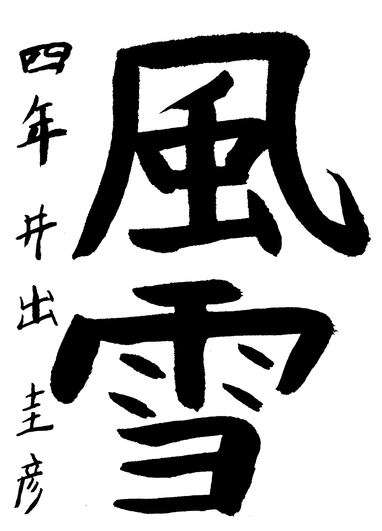 四年生。「風雲」とても難しい課題でしたね。特に”風”のカゼガマエの形とその中の虫の大きさが課題でした。カゼガマエは内側にそって、三分の一くらいから左下に向かいましょう。虫の縦線を三等分するように口を立派に書きたかったですね。雪の点の打ち方が雑なのは、だめですね。点でも線です。