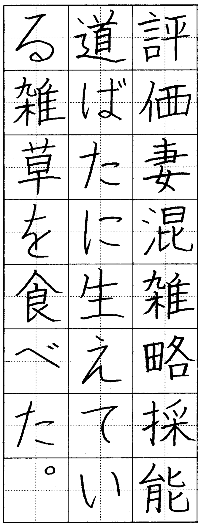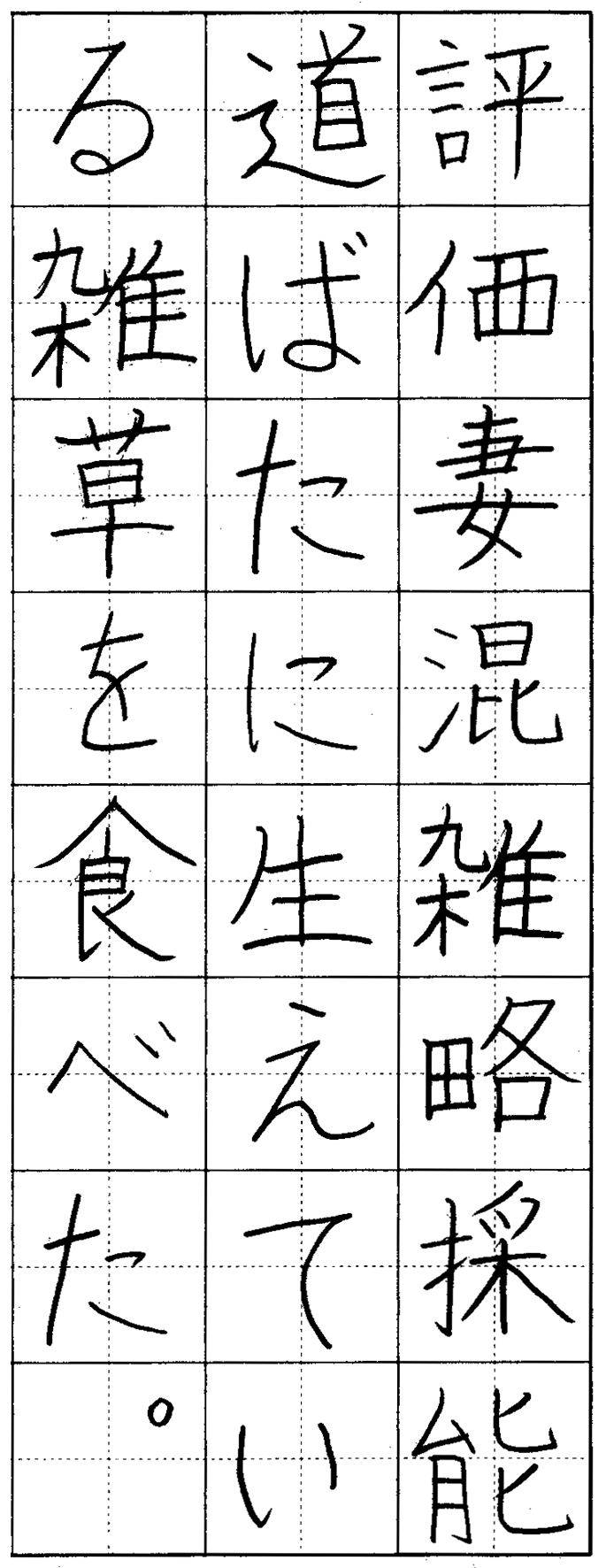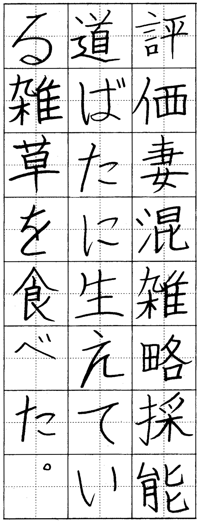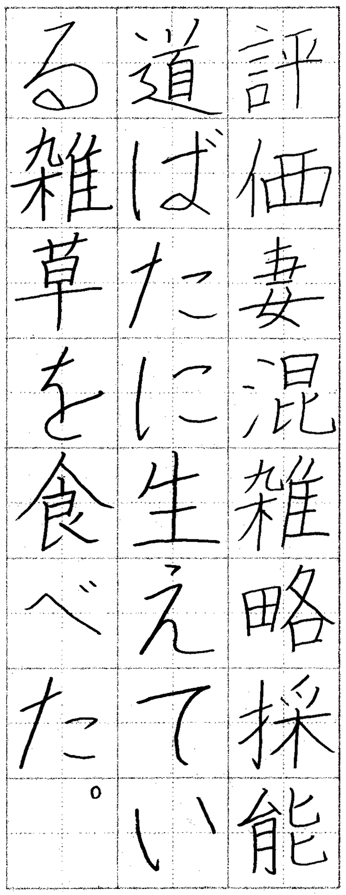 五年生も先月に比べると安定感がなかったようですね。マスからはみ出した字。文章の平仮名の終筆で「に・て」がながれているもの。漢字の横画が右下がりになっている「価・採・雑」の字はおかしいですよ。漢字の横画は右上がりにすることで意思の強さを表現します。でもやりすぎには要注意ですよ。