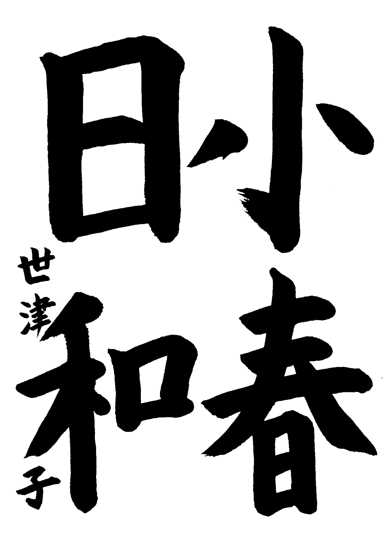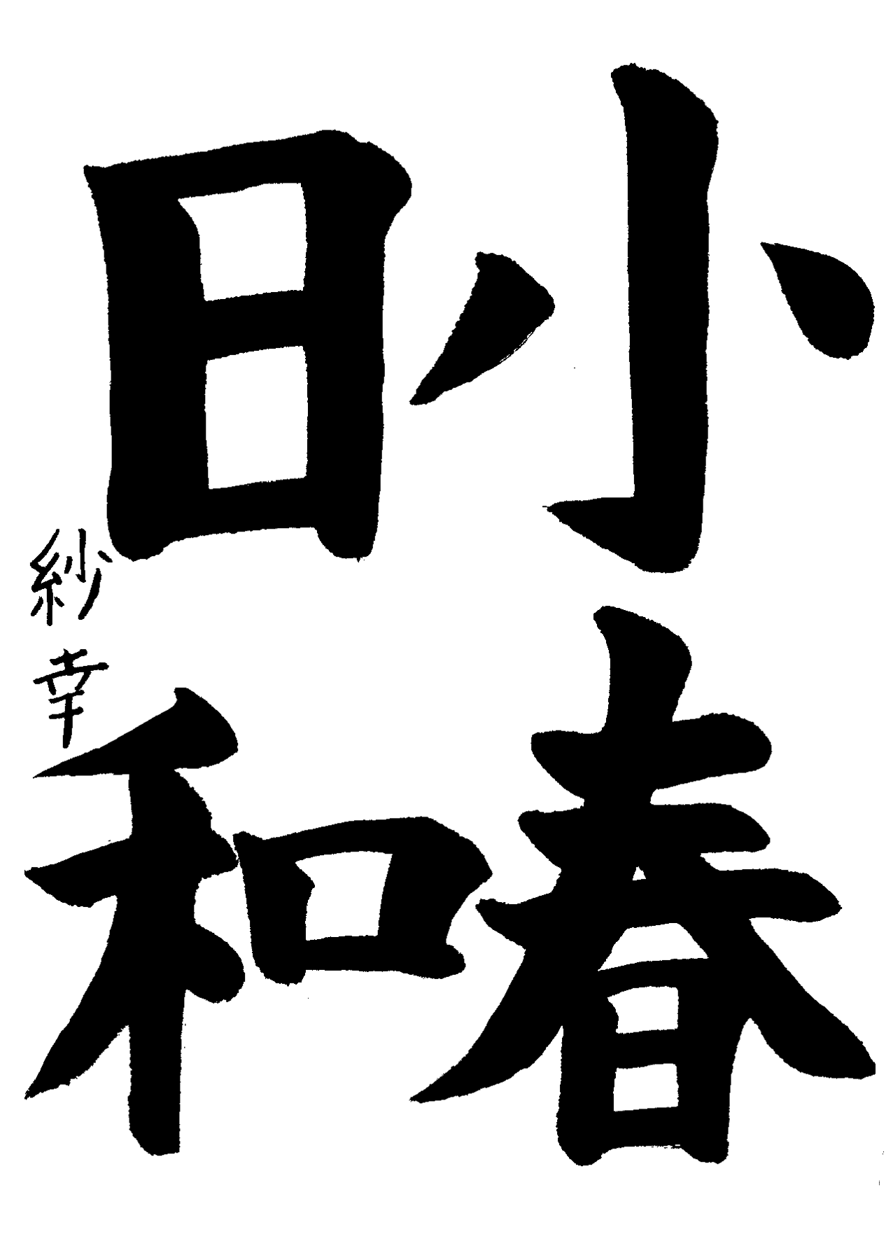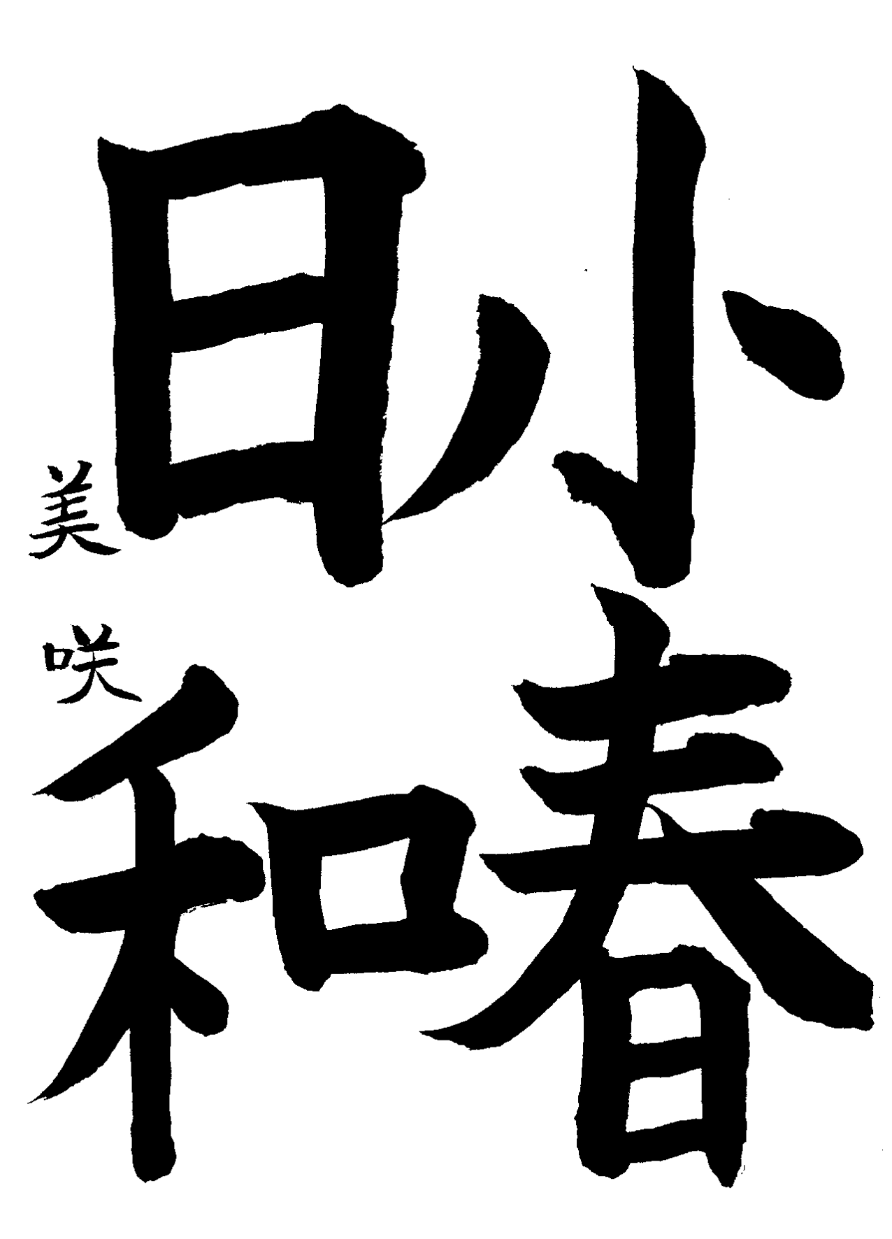 五年生。十一月なのに「小春日和」です。とてもみなさん、よくかけています。起筆・収筆のまとめ方が上手になりました。横線と縦線の筆圧の違いを表現できるようになると良いですね。そのようにすると太細の変化が生まれます。当然、楷書は縦線を太くしましょう。