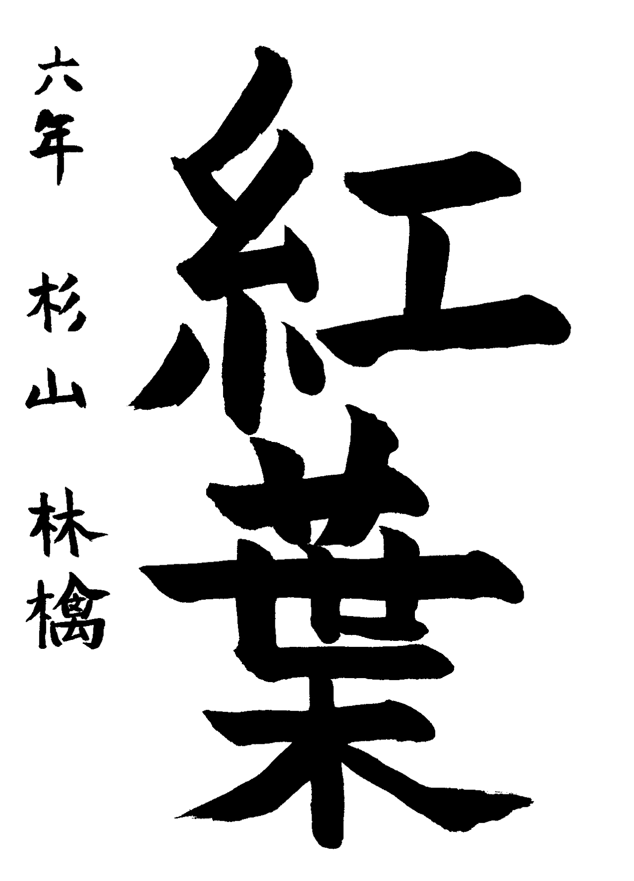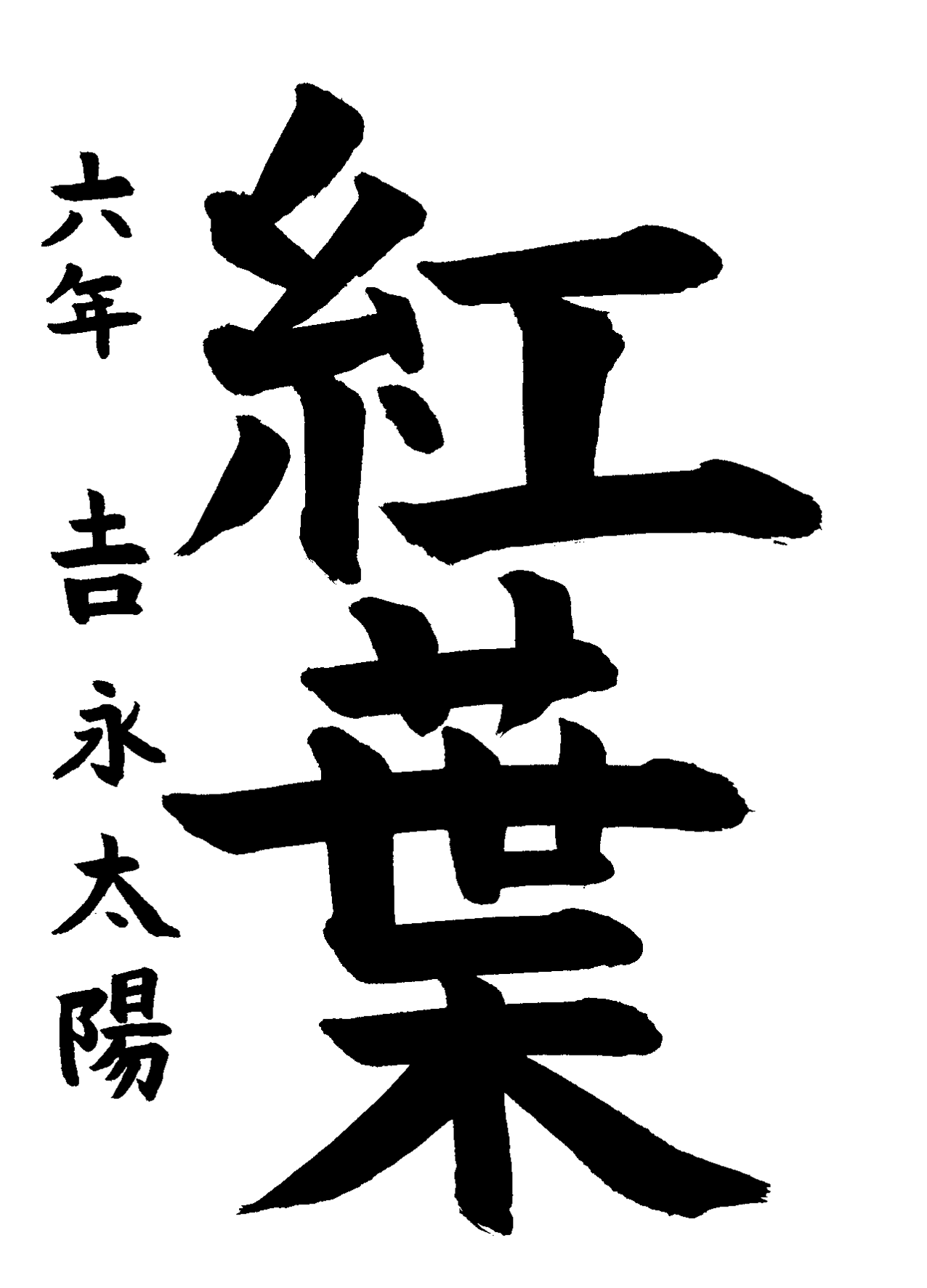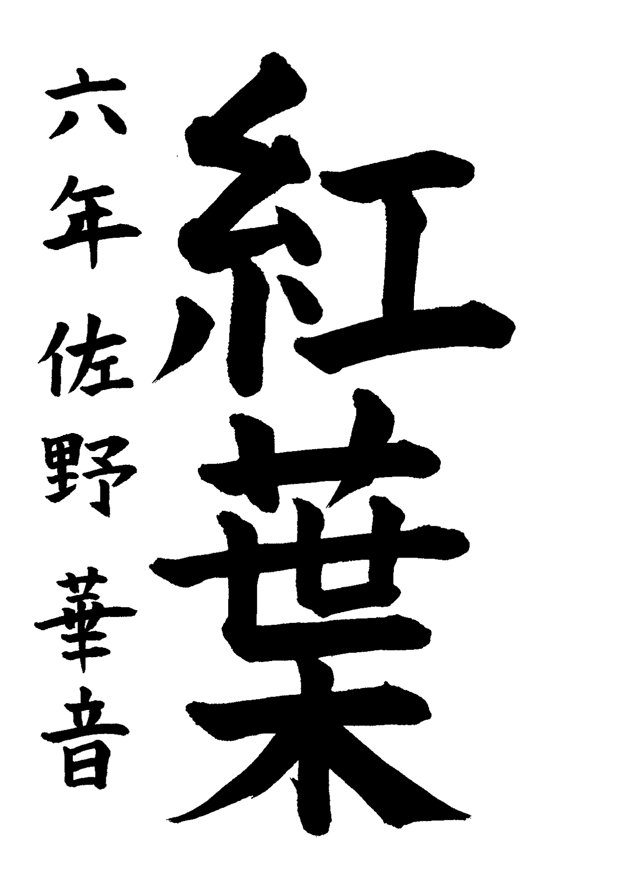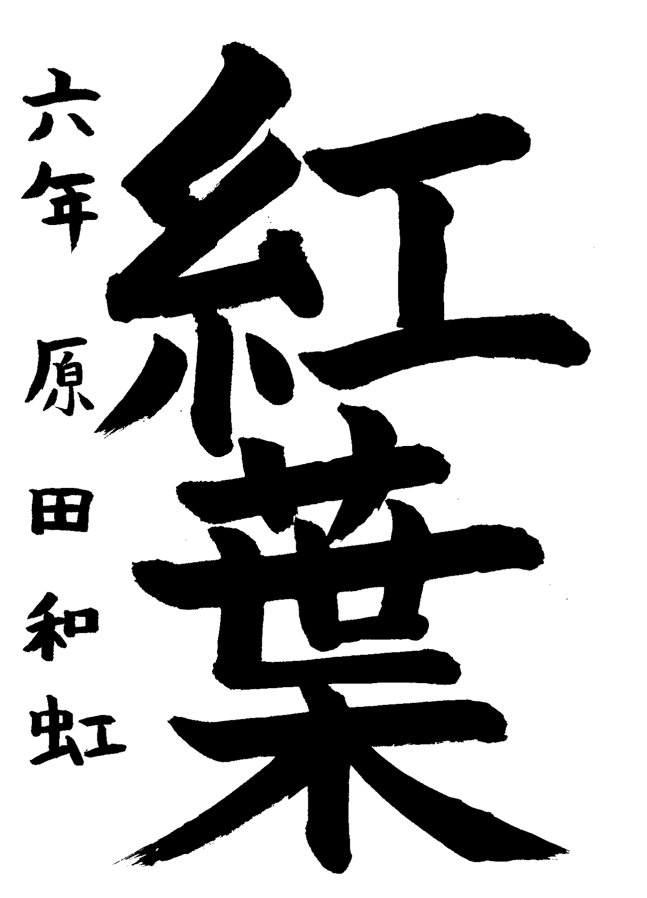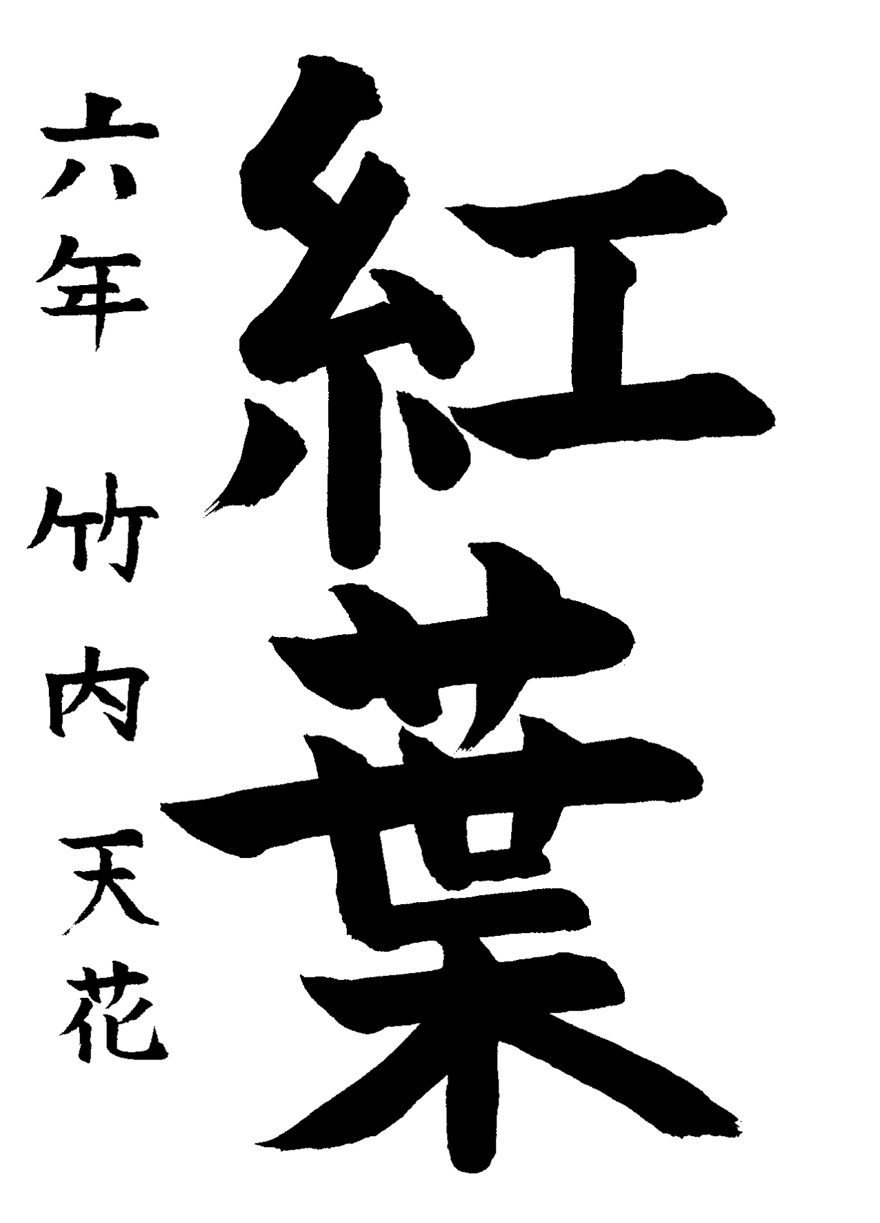 六年生。硬筆のところでも述べましたが、少し筆圧が弱いですね。もっと鮮やかな紅をイメージして枯れない葉を表現してほしかったですね。二文字の時は、学年と名前をもっと堂々と書くように心がけましょう。書き初めの時はフルネームですから!