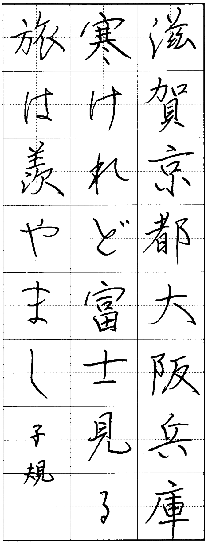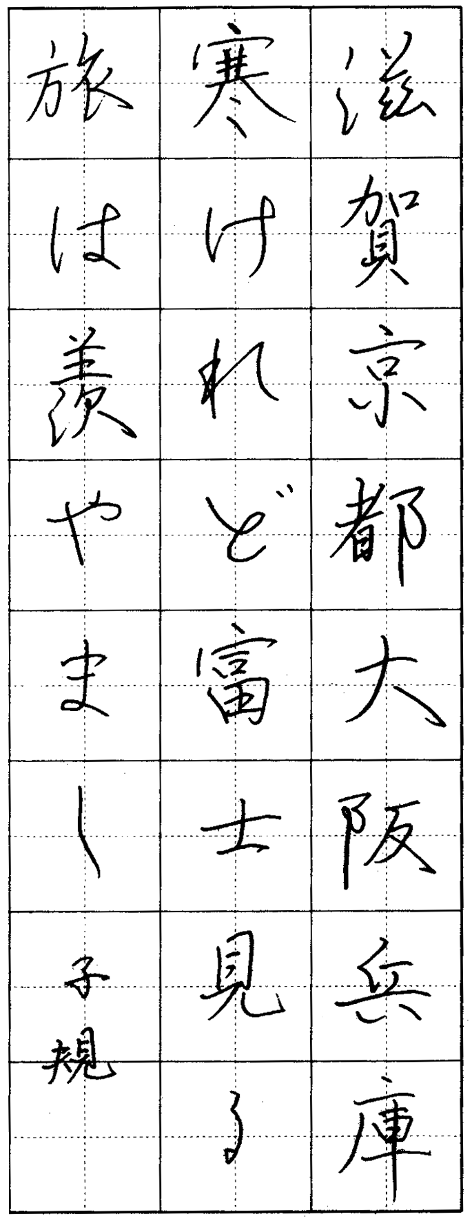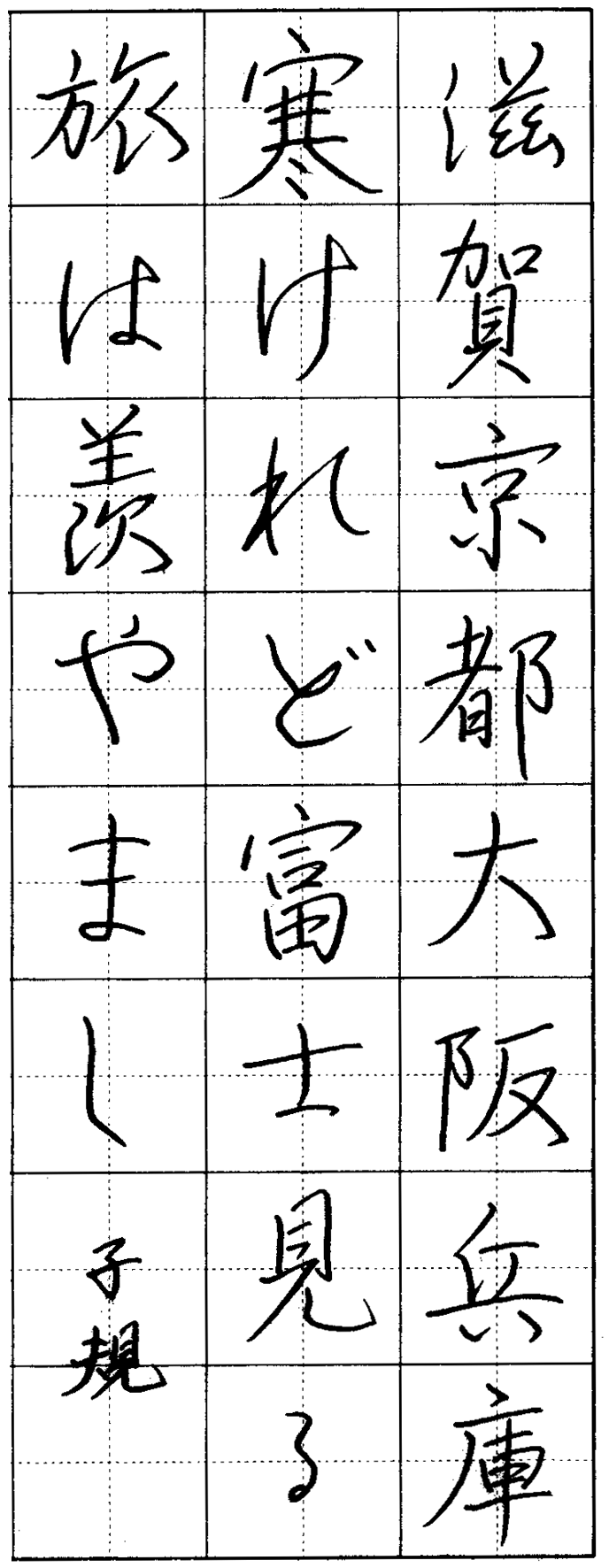 みなさんが、習っているのは、行書という書体です。みなさんが小学生までにならってきた書体は、楷書といいます。基本的に、①右上がり②起筆・送筆・収筆という3ポイントを有しています。これに対して、行書は①曲線を用いる②点画が連続性を持つ③点画が省略されることがある、を意識して書くことが大切です。